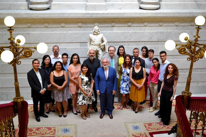 Alumnas del curso 2013-2014 de la ELH con los directores de la RAE y de la Academia Chilena de la Lengua, acompañadas del académico Salvador Gutiérrez, director adjunto de la Escuela, y de su jefa de estudios, Loreto Verdú.