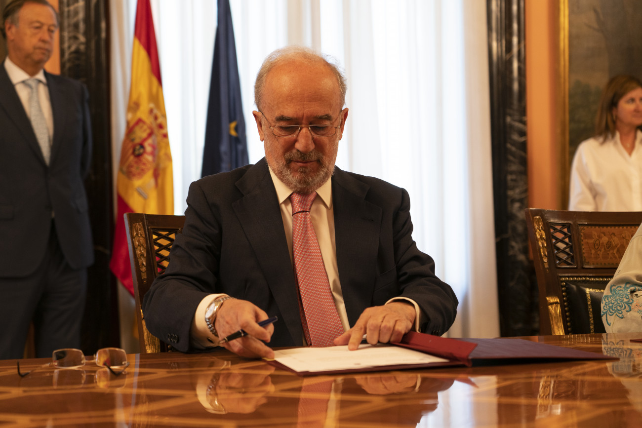 El acto de firma del convenio entre ambas entidades ha tenido lugar este miércoles 17 de julio en la sede del Ministerio de Hacienda. Ha contado con la presencia de Santiago Muñoz Machado, director de la Real Academia Española y presidente ejecutivo de ASALE; Jesús Huerta Almendro, presidente de SELAE, y María Jesús Montero, ministra de Hacienda en funciones.