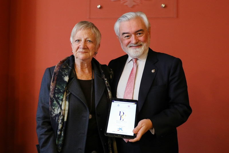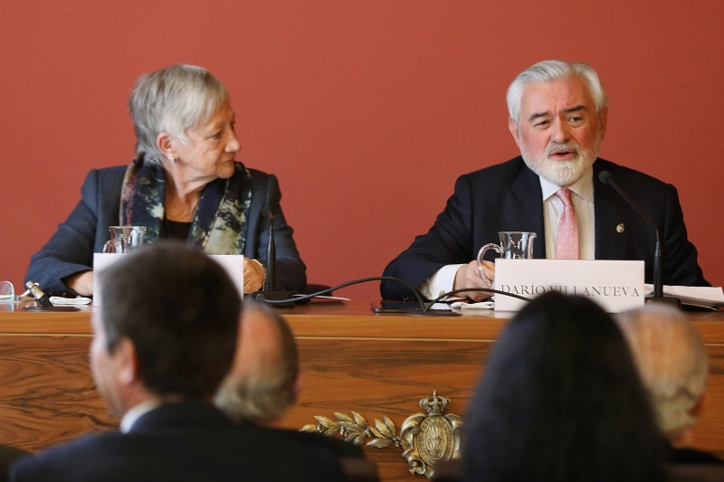 El director de la Real Academia Española (RAE), Darío Villanueva, y la académica directora del Diccionario de la lengua española (DLE), Paz Battaner, han ofrecido esta mañana una rueda de prensa en la que han presentado a los medios de comunicación las actualizaciones de la versión en línea de la vigesimotercera edición del DLE.