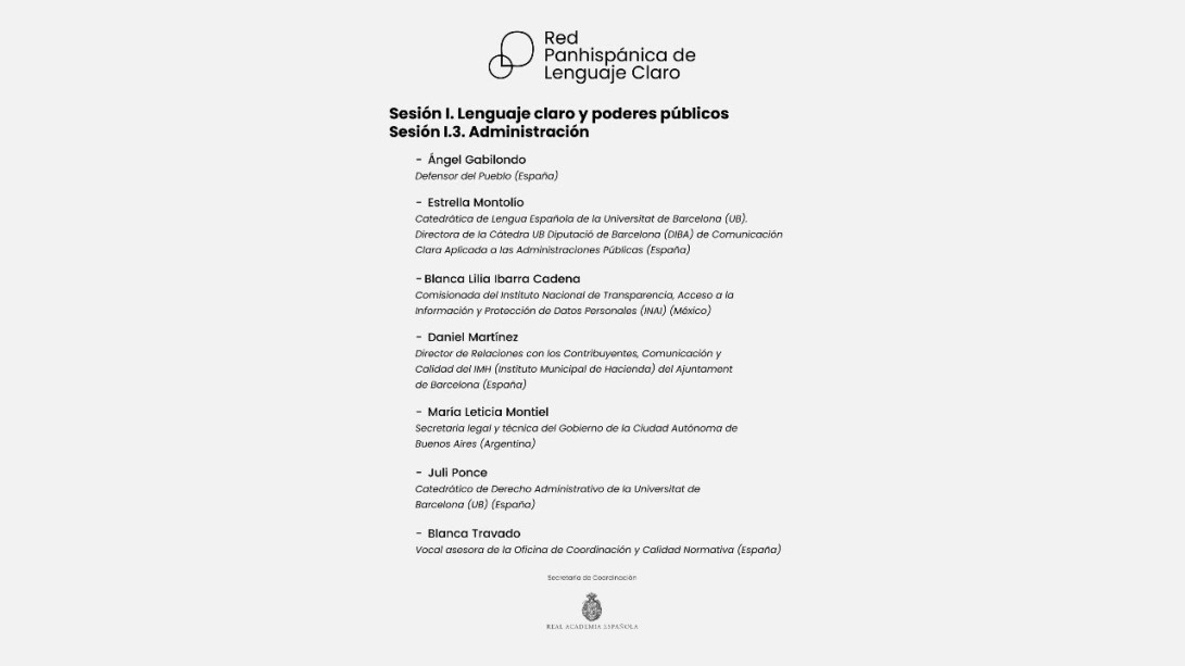 Los días 20 y 21 de mayo se ha celebrado en la Real Academia Española (RAE) la I Convención de la Red Panhispánica de Lenguaje Claro. Durante la primera jornada, ha tenido lugar una sesión inicial enfocada en el lenguaje claro y los poderes públicos, articulada en tres mesas diferenciadas: «Legislación», «Justicia» y «Administración».