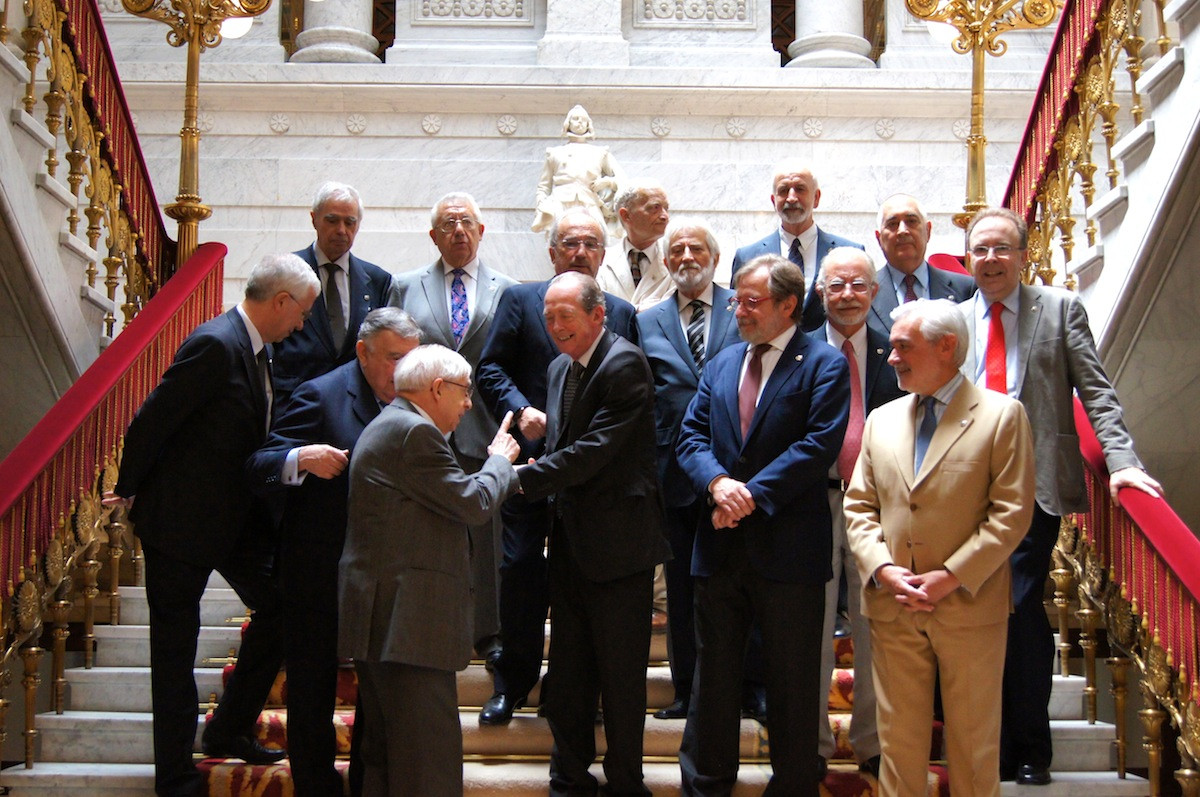 Hoy, con motivo de esta efeméride, un grupo de quince académicos se ha reunido en la sede de la institución y ha posado para la clásica foto de familia. Es un retrato que se hace, por tradición, en la denominada «escalera de Quevedo», cuya estatua se encuentra al final del primer tramo de peldaños.