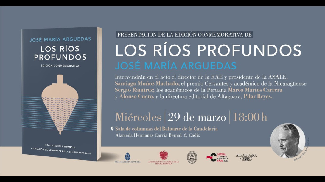29 de Marzo de 2023La Real Academia Española (RAE) y la Asociación de Academias de la Lengua Española (ASALE) han presentado una nueva edición conmemorativa, coordinada por la Academia Peruana de la Lengua y con la colaboración de Alfaguara: Los ríos profundos, de José María Arguedas. La presentación ha tenido lugar en el Baluarte de la Candelaria de Cádiz, en el contexto del IX Congreso Internacional de la Lengua Española, que acoge la ciudad andaluza.