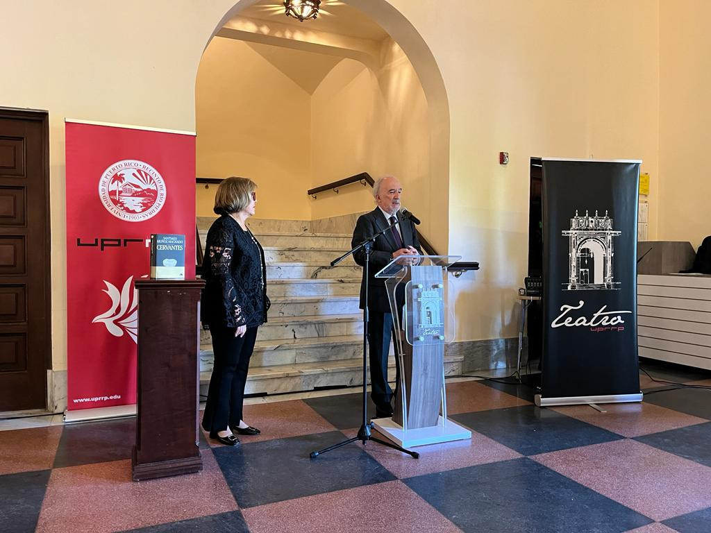 Posteriormente, en el vestíbulo del Teatro, el director ha disertado sobre «Vida, obra y época de Cervantes» en un acto al que han asistido, junto al cónsul de España en San Juan, Josep María Bosch, académicos de distintas corporaciones, profesores, alumnos y representantes de diversos ámbitos culturales. Tras el saludo inicial de la rectora interina, la académica y profesora de la UPRRP María Inés Castro ha presentado al director para dar paso después a su conferencia. Ha cerrado el acto la intervención musical del coro de la Escuela Superior de la Universidad de Puerto Rico.